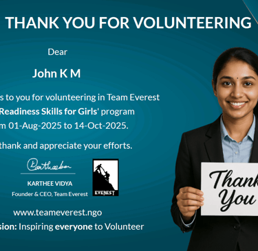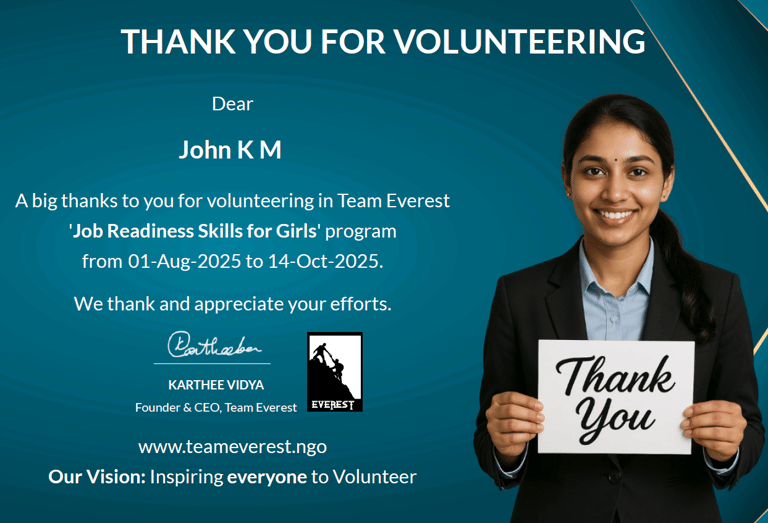 I was delighted to be part of Everest NGO who is into empowering children of the economically weaker sections to be educated and skilled. I volunteered in the 'Job Readiness Skills for Girls Program'. It was a 30 day program involving a comprehensive curriculum enabling a girl to be job ready. It covered various aspects including awareness on various careers, strengths and weakness analysis of oneself, resume writing, interview preparation and designing a career roadmap.